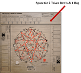 Everything has a place or space on the board. You've even got room for the token holders and draw bag! I need to flip the 1 player's side and the divider lines don't quite hit the board edge, but you can see where this iteration is going. I like the new way the Household Omens Board is laid out and it makes more sense to move the Household Omen Effect Cards up there too. Also, this allowed me to blow up the interlocked pentagram of the Talking Spirit Board Track to take up more space relative to board size. And that's a change that'll hold for the big board and the smaller board. The big board will have tarot-size tarot cards, 2.5" square Household Omens/Good Luck Charms/Hex Breakers and the Household Omen Effect Cards will be mini cards. The small board... I'm thinking the tarot cards will be bridge-sized. The rest... it's a work-in-progress :geek_grin:.