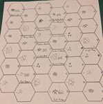 I have played a couple partial campaigns of the game so far, with massive changes to the rules each time. Below is an image of the hex map produced by the first prototype campaign after twenty-four games.