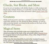 Leaving aside the plot based/scenes/chapters issue, it’s the situations here that are frustrating. I get situations. I love them. And open-ended play and a sandbox. Great. If I squint hard I can tell that the designer is TRYING to support the DM. There’s an attempt to explain what is going on so the DM can improvise and adapt. But the emphasis is on the wrong spots. Those motivation and background parts should be shorter and the encounters/situations more specific. It’s too open-ended where it needs specificity and too wordy in the parts that are to support “off the rails” play. The formatting also doesn’t contribute to locating information easily for the off the rails portion.