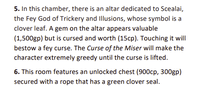 Are you not entertained? What type of gem? No altar description. Nothing about an evocative curse detail. It’s not that any one of those things would make this stand out, but it’s all the bare minimum. This is what you are paying your money for. And there’s not much more here than a random number generation on a table would provide.